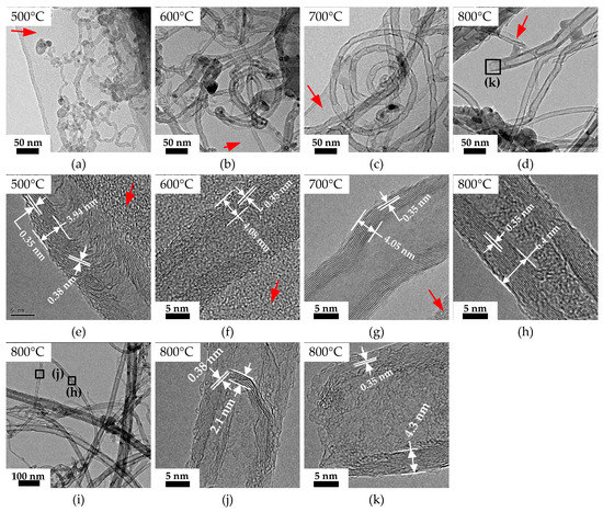 Figure 6 shows the HRTEM micrographs of CNT ethanol dispersions dropped on a carbon-coated TEM grid. The CNTs tangle with each other, and their layers are in the range of 10–20, respectively. The wall thickness and distance between layers of the CNTs at different temperatures were measured, as shown in Figure 6. The walls of the CNTs at all temperatures are tightly aligning with a high density of graphite sheets, with a distance between layers of 0.35–0.38 nm. The layer number and wall thickness of carbon nanotubes increase with the increase of temperature. A large number of amorphous carbon layers attached to the CNTs produced at low temperatures, as shown by red arrows in Figure 6. With the increase of the temperature, the content of amorphous carbon decreased. This phenomenon is consistent with our Raman analysis results. The CNTs prepared at 700 and 800 °C consist of hollow compartments, looking like bamboo, which are not apparent at 500 and 600 °C. The carbon walls of the hollow always bulge towards the root of the CNTs. According to the vapor–liquid–solid growth method, in the growth process of CNTs, active liquid Fe nanoparticles dissolve gaseous carbon particles and then precipitate carbon atoms to form CNTs. The carbon dissolution rate of active liquid Fe nanoparticles at the temperature of 700 and 800 °C is higher than that at 500 and 600 °C, so the growth rate of CNTs is faster. When the carbon dissolution rate of Fe nanoparticles is higher than that of precipitation, new carbon layers formed, resulting in the bamboo structure.