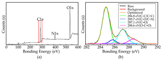 XPS measurement was carried out to investigate the surface functional groups of the synthesized CNTs. As shown in Figure 7a,b, the CNTs contain C, N, and O, and the magnified view of C1s peak indicate that they are mainly composed of C-C/C=C (284.8 eV, 59.27%), and the surface defects of CNTs are -C-OH/C-N (285.7 eV, 5.33%), -C=O (287.1 eV, 26.73%), and -COOH (288.6 eV, 8.67%). The oxygenated functional groups on the surface of CNTs were mainly from the hydroxyl groups obtained from ethanol decomposition, which caused the high defect concentration of the CNTs.