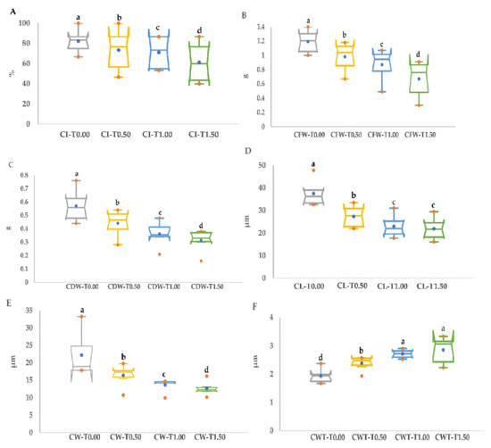 Box charts of growth characters of the kernel-derived calli from six rice genotypes, revealing the significant divergences between normal and stress conditions. (A). callus induction (CI), (B). callus fresh weight (CFW), (C). callus dry weight (CDW), (D). cell length (CL), (E). cell width (CW), and (F). cell wall thickness (CWT). The numbers given are the average values computed for the six measurements found for control (T0.00), and polyethylene glycol (PEG) concentrations (T0.5, T1.00, and T1.50). Different letters indicate a significant variation between box mean values by Duncan’s multiple-range analysis (p ≤ 0.05). A blue dot in the box represents the mean value. Red dots denote the minimum and maximum values, while extreme values (outliers) are depicted as dots outside the whiskers.