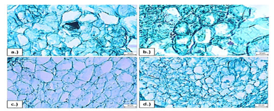 The effect of osmotic stress induced by different polyethylene glycol (PEG) concentrations on the callus morphology in rice genotypes, including cell length, cell width, and cell wall thickness: (a) Choman at 0.00% PEG, (b) Choman at 1.50% PEG, (c) Gwll Swr at 0.00% PEG, and (d) Gwll Swr at 1.50% PEG.