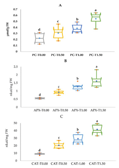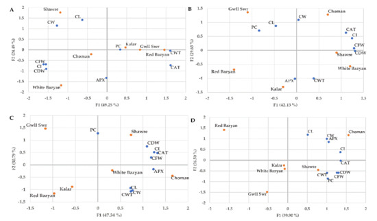 The findings of our analysis revealed that there were major variations between the genotypes under non-stress and stress conditions for the proline content and antioxidant enzyme activities (APX and CAT) (Table 7). Notable differences between these characteristics were established between the four groups (Figure 3) across the six genotypes. Larger distribution ranges were seen in the proline content (PC) under all conditions. The smallest distribution ranges between unstressed and stressed groups were revealed in APX and CAT under the T0.50 condition. Under the optimum condition (T0.00), Gwll Swr, Red Bazyan, and White Bazyan registered the best values in PC (0.31 µmol/g FW), APX (0.81 nkat/mg FW), and CAT (10.49 nkat/mg FW) activities, respectively. At T0.50, the ranges of PC, APX, and CAT were from 0.21 to 0.46 µmol/g FW, 0.75 to 1.11 nkat/mg FW, and 16.55 to 26.98 nkat/mg FW, respectively. Choman had the largest output values of APX and CAT actions under the T1.00 and T1.50 stress treatments and Shawre showed the maximum PC value. For the overall stress conditions, the genotypes’ resistance/susceptibility rating according to the PC, APX, and CAT characteristics was as follows: Choman > Shawre > White Bazyan > Gwll Swr > Red Bazyan > Kalar (Table 8). In addition, the degree of metabolic alterations in response to stress was associated with the reported sensitivity/tolerance phenotype.