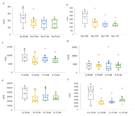 Box charts of inorganic elements of the kernel-derived calli from six rice genotypes, indicating wide differences between control and stress conditions. (A): Na, (B): Mg, (C): P, (D): S, (E): K, and (F): Ca. The numbers given are the mean values determined for the six measurements obtained for control (T0.00), and PEG concentrations (T0.5, T1.00, and T1.50). The different letters indicate a significant variation between the mean values of each trait by Duncan’s multiple-range analysis (p ≤ 0.05). A blue dot in the box represents the mean value. Red dots denote the minimum and maximum values, while extreme values (outliers) are shown as dots outside the whiskers.