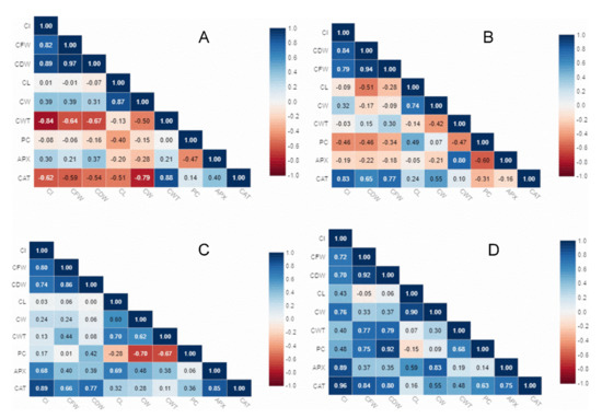 Pearson correlation (r) of nine growth and biochemical characters based on their values in unstressed and stressed conditions. (A). T0.00, (B). T0.50, (C). T1.00, and (D). T1.50.