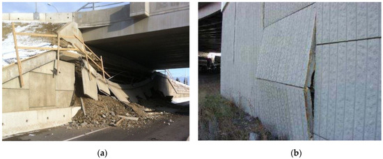 An illustration of (a) Mechanically stabilized earth (MSE) wall failure that could have started with (b) an excessive bulging at the joint between neighboring panels (images sourced from Jensen [8]).