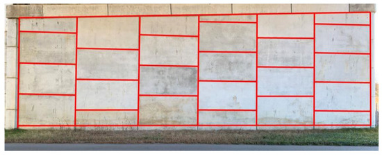 An image covering a portion of the MSE wall with smooth panels (the boundaries of the different panels are highlighted by red rectangles).