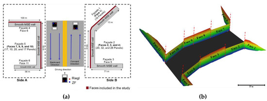 A smooth MSE wall in the U.S. State of Indiana was selected as a case study in this research to test the capability of the MLS used as well as the feasibility of the proposed processing strategy in deriving the and angular distortions as well as the performance measures introduced by Lin et al. [5]. The overall capability of mobile LiDAR in examining an MSE wall is evaluated by comparing the measures derived with those based on data collected by a TLS. For the TLS data acquisition process, a Faro Focus x330 (Faro, Mary, Florida, USA) with a range accuracy of ±2 mm at an object distance of 25 m was used [20]. This scanner emits close to one million pulses per second with a maximum range of 330 m and produces a color-coded point cloud (i.e., the scanner is equipped with a camera and a scene is scanned twice to collect the ranging and RGB data). Figure 4 depicts a portion of the MSE wall that has piece-wise planar façades (i.e., where the façades cannot be modeled as a single planar surface).