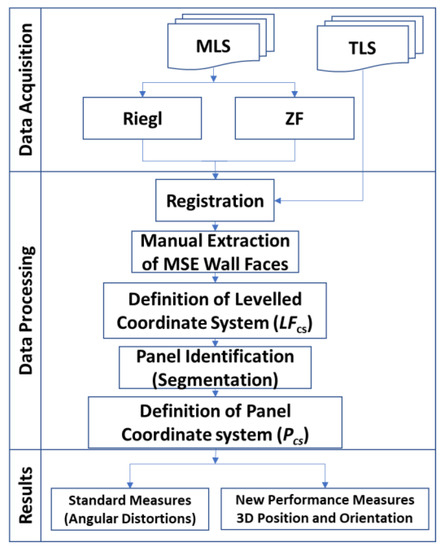 This research work starts by providing a coverage of existing strategies for MSE wall monitoring, while emphasizing those employing LiDAR point clouds, in Section 2. The used MLS in this study is introduced in Section 3, which also covers the data acquisition for the case study conducted to illustrate the comparative performance of MLS and TLS. The proposed methodology is then presented in Section 4. Experimental results from the data processing/reduction strategy for the case study are discussed in Section 5. Lastly, Section 6 presents the conclusions and suggestions for future research direction.