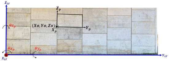 Defining the coordinate systems for the MSE wall face in question () and the enclosed individual panels () is the next step. These coordinate systems, which are shown in Figure 8, are used for determining both global and local serviceability measures. The is defined by the best-fitting plane through the face in question and the local horizontal/vertical directions at the MSE wall site. More specifically, the y-axis of the is defined along MSE wall face (as defined by the fitted plane parameters) and is parallel to the horizontal plane of the mapping coordinate system at the study area. The z-axis of the is established to be parallel to the plumb line at the MSE wall site. Finally, the x-axis of the is derived to define a right-handed coordinate system. To enable straightforward derivation of the , the geo-referencing parameters from the MLS are established in a local mapping coordinate system with the z-axis pointing in the local level (plumb line) direction at the MSE wall site location. The is needed for deriving the panel-to-leveled face differential rotation and translation as well as the panel-to-panel displacement. As can be seen Figure 8, the panel coordinate system is defined with its y- and z-axes aligned along the bottom and left sides of the bounding rectangle enclosing the panel in question. Finally, the x-axis of the is derived to define a right-handed coordinate system (i.e., it is defined by the normal to the panel surface). A key prerequisite for a reliable derivation of the local serviceability measures is to ensure that the is defined in a similar manner for all the panels within a particular face. For this purpose, this study utilizes a region-growing segmentation procedure to identify the points constituting the individual panels (these points are then used to define the panel coordinate systems by deriving the MBRs that enclose them). For the panel segmentation, the Local Point Spacing (LPS) and normal distance () from the best-fitting plane to the MSE wall face are used as the region-growing criteria. The fundamental assumption for the segmentation using such criteria is that points with large normal distances from the best-fitting plane correspond to the joints between neighboring panels. The details of MSE wall face partitioning and panel identification are included in Section 4.3. The aforementioned performance measures can be derived once the coordinate systems are defined and the individual panels are isolated from the point cloud along a partitioned face. Section 4.4 describes the derivation of global and local performance measures for MSE walls with smooth panels.