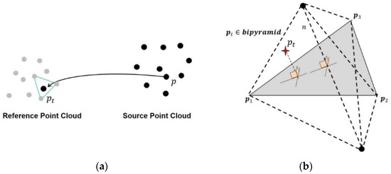 (a) source to reference point cloud transformation for a given point, and (b) condition for accepting point-to-patch correspondence for a transformed point (Al-Rawabdeh et al. [29]).