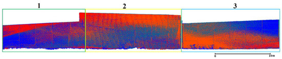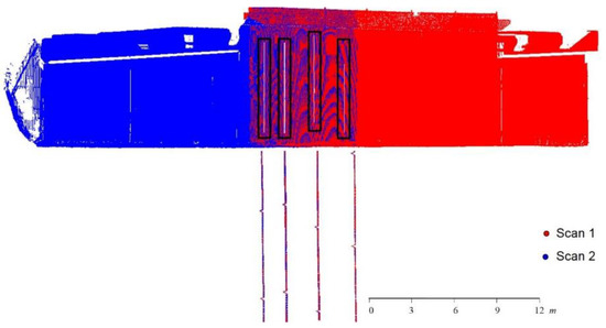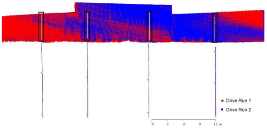 Point cloud registration was sequentially executed to align: (1) MLS point clouds captured by the onboard two scanners for each drive run, (2) MLS point clouds from neighboring drive runs, (3) TLS point clouds from three scan stations, and (4) MLS and TLS point clouds. The estimated transformation parameters for the alignment of the point clouds from the two scanners in a given drive run were used to assess the quality of the system calibration procedure (major deviations from zero shifts/rotation angles would be an indication of inaccurate system calibration procedure). To quantitatively assess the quality of the GNSS/INS trajectory, the evaluated transformation parameters when aligning point clouds from different drive runs are used (i.e., significant deviations from zero shifts/rotation angles is an indication of less than optimal GNSS/INS trajectory). In this regard, one should note that the registration of the TLS and MLS point clouds was only performed to ensure that there were uniquely defined local vertical and horizontal directions within the study site (i.e., there is not quality control aspect associated with the derived estimates of the transformation parameters in this case). To evaluate the comparative performance of TLS and MLS-based inspection strategies, the results for three faces (with a total of 76 panels) along façade 2 of the MSE wall (i.e., the façade covering faces 2, 3, and 4) are examined. Two MLS drive runs in opposite directions at the vicinity of the MSE wall were used for this comparative test. Six registration steps were performed. Registration of the Riegl and ZF scans in each drive run was conducted in the first and second steps of the analysis. In the third step, alignment between the combined/registered scans from the two drive runs was achieved. Then, three TLS scans were registered to a unified coordinate system in two successive steps. Finally, the TLS and MLS point clouds were registered to the MLS reference frame. For qualitative evaluation, Figure 15, Figure 16, Figure 17 and Figure 18 illustrate four vertical profiles—which were manually extracted to highlight the alignment quality of point clouds from the two scanners (i.e., Riegl and ZF) in a given drive run, point clouds from two drive runs in opposite directions, point clouds from the TLS scan stations, and point clouds from the TLS and MLS units. The profiles in these figures verify the good alignment among the different point clouds following the proposed registration process.