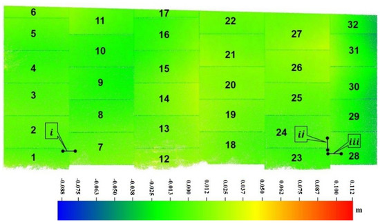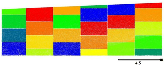 A semi-automated procedure is developed in this study to isolate the faces and the panels of the MSE wall. This is done by partitioning the MSE wall façade into individual faces that can be deemed planar (Figure 11). The sectioning process is manually accomplished while fitting a plane to the constituent points to evaluate the planarity of the derived partitions. A sectioning is considered acceptable if the RMSE values of the normal distances of the points from the best-fitting plane through the different sections are below a threshold, which is defined according to the noise level in the data. If the derived RMSE values are larger than the inherent noise level in the point cloud data (which is in the order of 1.5 cm), the partitioning process is revised. The is defined, as discussed in Section 4.1, once the individual faces are finalized. A region-growing segmentation technique is then applied for each face to cluster points comprising the individual panels, as described by Habib and Lin [30]. The similarity criteria for the region growing process includes the local point spacing (LPS) and normal distance () between the points and the fitted plane through the face. More specifically, a point is augmented into a segmented region if it is within a multiplication factor of the LPS and a normal distance threshold. For the involved point clouds in this work, the multiplication factor is in the range of 2.0–2.5 and the normal distance threshold is in the range of 0.01–0.03 m. The segmentation result for one face is shown in Figure 12. Following the panel segmentation technique, the for a given panel is simply established by deriving the MBR enclosing that panel, as proposed by Lin et al. [5]. More specifically, the x-axis of the is oriented along the normal to the best-fitting plane through the points covering that panel. The y- and z-axes of the are aligned along the bottom and left sides, respectively, of the MBR enclosing the panel in question, as can be seen in Figure 8. Having defined the and , the different serviceability measures can be established.