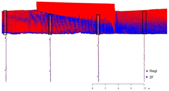 Vertical profiles illustrating post-registration alignment quality of two TLS scans covering faces 2, 3 and 4 along façade 2 of the MSE wall.
