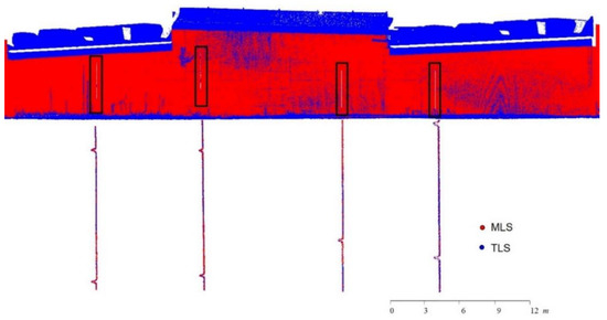 Vertical profiles illustrating post-registration alignment quality of TLS and MLS point clouds covering faces 2, 3 and 4 along façade 2 of the MSE wall.