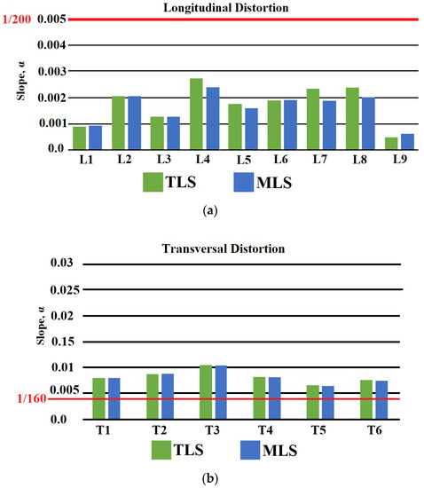 The and angular distortions for the MSE wall planar face depicted in Figure 13 and the recommended tolerable values (denoted by the red lines) are illustrated in Figure 19. The angular distortions were assessed using the longitudinal and transversal lines in Figure 13 (i.e., L1 to L9 and T1 to T6 for and respectively). The horizontal line in Figure 19a shows the tolerable (1/200) for a joint width of 19 mm and panel area of 4.5 m2. The horizontal line in Figure 19b, on the other hand, shows the post-construction tolerable and (1/240), as suggested by AASHTO [6]. Figure 19 shows that both and derived from the MLS are closely similar to those obtained using the TLS point cloud. This similarity confirms the capability of MLS in achieving a reliable, high-quality assessment of standard serviceability measures. As far as the MSE wall evaluation is concerned, Figure 19a,b show that this wall meets the tolerable measure. However, it does not meet the tolerable measure.