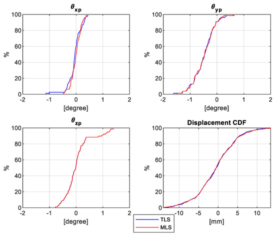 Cumulative Distribution Functions (CDF) for panel-to-leveled face orientation angles and panel-to-panel displacement using TLS point cloud (in blue) and MLS point cloud (in red) for 76 panels constituting three faces along MSE wall façade 2.