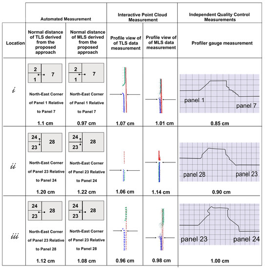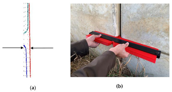 As mentioned earlier, one of the assumptions for a well-constructed MSE wall is that joints (i.e., gaps) between neighboring panels are within a tolerable range and have minimum offsets along the x-axis of the (i.e., along the face normal direction). To evaluate the accuracy of the automatically-derived panel-to-panel normal displacement between adjoining panels, such distances have been compared to interactive measurement of the displacement in the TLS point cloud, MLS point cloud, and on-site profiler gauge measurements derived at locations , , and —refer to Figure 21. The individual checks of the panel-to-panel normal displacement are shown in Figure 22—where Figure 22a shows the manual measurements from the point cloud and Figure 22b shows the on-site profiler gauge measurements. In this regard, one should note that the on-site profiler gauge measurements are an independent evaluation of the absolute accuracy of derived normal distances. The estimated values for panel-to-panel normal displacements from the above approaches are shown in Figure 23. The results in Figure 23 indicate that the panel-to-panel normal displacements from the TLS and MLS data as evaluated by automated approach or interactive measurement of the displacement in the LiDAR point cloud as well as the on-site profiler gauge measurements were in good agreement (i.e., the reported numbers in Figure 23 are within the range of ±0.5 cm).