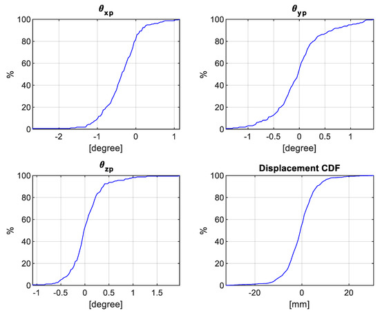 Now that we evaluated the comparative performance of TLS and MLS in reporting global and local serviceability measures, one can proceed with evaluating the measures for the MSE wall that has been surveyed by the MLS. Regarding the whole MLS dataset, Table 5 provides summary statistics of the proposed serviceability measures, derived using the MLS point clouds from different drive runs, for the complete and non-occluded panels of the smooth MSE wall (160 panels in total). Figure 24 shows the CDFs for the three angular values (, , and ) and panel-to-panel normal distance of the MLS dataset in this case study site. The graphical summary in Figure 24 is much easier to use for identifying trends and outliers than examining the values of each individual panel of the MSE wall. As can be seen in Table 5, the angular deviation values were less than 1° for the tilts around the x-, y-, and z-axes. Table 5 also shows that 95% of the panels had an offset less than 1.00 cm, which indicates that the MSE wall meets the acceptable out-of-plane offset recommended by FHWA [7].
