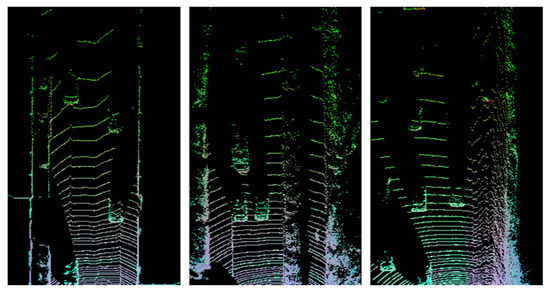 The size of the point cloud top view image is associated with the ranges of x and y of the point cloud. The resolution of a 3D LiDAR sensor decreases as the distance increases; thus, the area of a point cloud in this study is limited for conversion to a top view image. The x-axis on the 3D LiDAR coordinate system ranged from 6 m to 46 m, while the y-axis ranged from −10 m to 10 m. In other words, the x-axis and the y-axis have a range of 40 m and 20 m, respectively. Furthermore, considering different heights of various vehicle types, the z-axis ranged from −2.5 m to 2.5 m for a 5 m range. Therefore, a top view image is generated only using a point cloud that is within the range of x∈ [6, 46], y∈ [−10, 10], and z∈ [−2.5, 2.5]. One pixel of the image represents a gap of 0.1 m. The generated point cloud top view image is 200 × 400 × 3 (width × height × channel). Figure 3 shows the top view image of the generated point cloud.