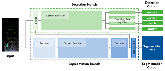 In this paper, therefore, we introduce a method for performing segmentation and detection simultaneously for an autonomous driving system that uses LiDAR. This method can be applied to any type of environment without distortion to ensure the safety and reliability of the decisions and control modules that need to be processed in real world implementation using limited computing resources. The proposed network aims to be more favorable for real-world processing (which is necessary for an autonomous driving system) and the reasonable performance of segmentation and detection. While previous networks require more than one processor for each network, using more than one independent network to perform two functions, the proposed algorithm allows two functions to be performed simultaneously in one network structure, with fewer processors than conventional algorithms.