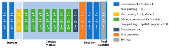 The structure of encoder before the context module is a 3 × 3 convolution filter with zero-padding of stride 1 and an ELU activation function twice in total, and 2 × 2 maxpooling with stride 2 for making a half size feature map. As shown in Table 1, the context module is designed with a 3 × 3 dilation convolution filter with increasing dilation rate and increasing reception field, spatial dropout, and ELU activation, and the last part is designed with a 1 × 1 convolution filter. The decoder corresponds to the reverse order of the encoder, restoring the reduced feature map from the encoder to its original size through max unpooling, 3 × 3 convolution filter and zero-padding of stride 1, and the ELU activation function repeats twice in total.