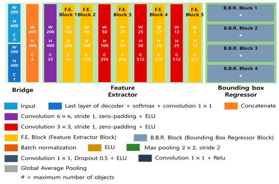 In SSADNet, the detection branch was connected to the segmentation branch to perform segmentation and detection simultaneously. The detection branch consists of the feature extractor and the bounding box regressor. Figure 6 shows (a) the feature extractor block (F.E. Block) for the feature extractor, and (b) the bounding box regressor block (B.B.R. Block) for the bounding box regressor, and Figure 7 shows the detailed structure of the detection branch. The feature extractor consists of five F.E. blocks. An F.E. block has a convolution filter layer which abstracts from simple features such as color, texture, edge, etc., to complex features which represent each class well, an activation layer, which gives non-linearity to the feature map in order to represent a complex model, and a pooling layer to reduce the feature map size or to prevent overfitting. In the detection branch, there are five F.E. Blocks (Feature Extractor) consisting of two 3 × 3 convolution filters with stride 1, batch normalization, ELU activation function, and 2 × 2 max pooling with stride 2, in order, and after each F.E. block except the first and last F.E. blocks, an additional 3 × 3 convolution filter with stride 1 is applied to extract the features.