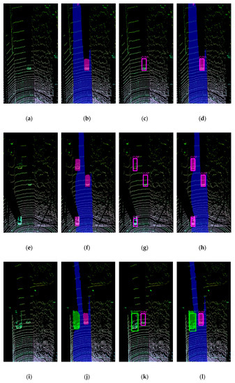For the ground truth of a vehicle, the coordinates of a vehicle in a front view provided by the KITTI dataset were converted in the same way as the bounding box label. The predicted results of the network for detecting road regions (LoDNN) [24] were applied to the KITTI dataset in order to generate the ground truth of the drivable areas. There is a limitation in generating a ground truth that is identical to the actual object, because the resolution of LiDAR decreases as the distance increases. However, we verified that it was possible to generate ground truth in the experiment. In the generated segmentation answer shown in Figure 8, the blue color represents the ‘drivable region’, the magenta color represents a ‘car’, the green color represents a ‘van’, the yellow color represents a ‘truck’, and the red color represents ‘other regions (background)’.