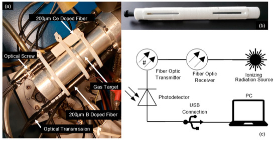 (a) 200 µm Ce-doped fiber and 200 µm B-doped fiber mounted to the 18F gas target. (b) 200 µm borosilicate fiber in plastic housing without the black tape wrapping to prevent background from ambient light. (c) Schematic of the setup.