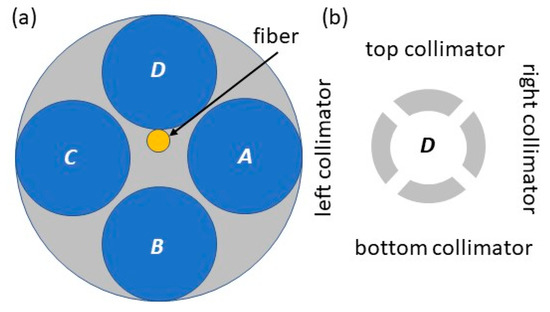 (a) Layout of the targets (blue) and fiber (yellow) in the inner position on the target selector (grey) looking upstream. Position A is housing a natural water target for the 16O(p,a)13N production, position B is a natural thallium target for the 203Tl(p,n)203Pb production, position C holds a target plug, and position D is an 18O(p,n)18F gas target. (b) Quadrant collimators in front of target port D looking upstream. Each target position has its own quadrant collimator.