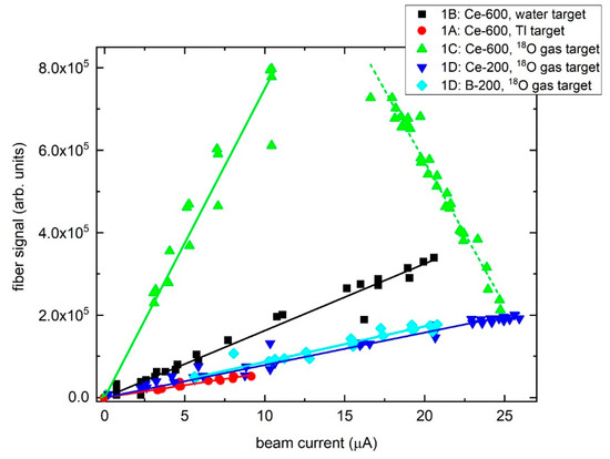 Response of the different fibers to changing beam current for different experiments. The R2 values of the linear fits are (1B) 0.9968, (1A) 0.9661, (1C ascending) 0.9397, (1C descending) 0.9905, (1D Ce-200) 0.9929, and (1D B-200) 0.9905, respectively.