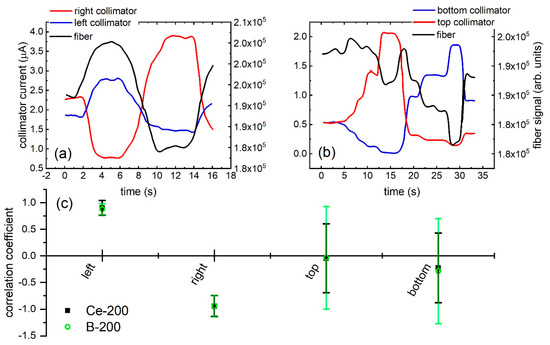In (a,b), the collimator currents are compared with the Ce-200 fiber’s signal while at a beam current on the target of 20 µA. Both fibers are mounted at the side of the target closest to the bottom collimator. The bar graph in (c) expresses the correlations between the collimator currents and the fiber signal when the target selector was moved in the plane that the collimators were positioned in, and the beam current’s correlation during these periods.