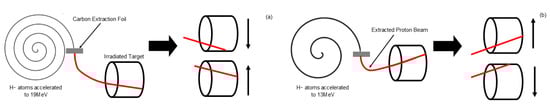 Illustrations comparing the 19 MeV (a) and 13 MeV (b) extractions and the resulting beam steering effects. The arrows indicate target movement in the left-right direction.