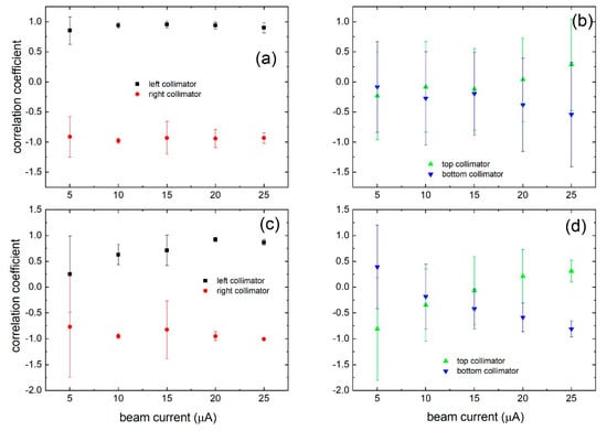 (a) Correlation coefficients as a function of beam current on target for regular steering up to 3 µA on the right and left collimator and (b) on the top and bottom collimator. (c) Correlation coefficients as a function of beam current on target for intense steering up to 5 µA on the right and left collimator and (d) on the top and bottom collimator.