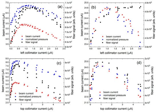 Beam current on target, normalized target pressure and Ce-200 fiber signal as a function of the (a) left collimator current at low beam current, (b) left collimator at high beam current, (c) top collimator at low beam current, and (d) top collimator at high beam current. Summary of n = 6 experiments using both the B-200 and Ce-200 fibers.