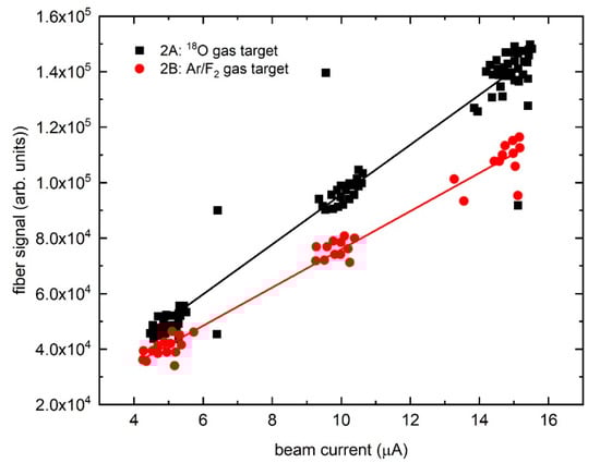 The Ce-200 fiber signal output generated via the irradiation of 18O gas and the Ar/F2 gas mixture in the same target body is compared in Figure 8. The results reflect that the fiber signal generated during the 18O(p,n)18F irradiation is greater than the signal from the irradiation of Ar/F2. We suspect that this is the result of more neutrons being generated in the 18O(p,n)18F reaction. According to these results, the signal–current relationship for a given target material could be calibrated in advance. During routine operation this technique could then be employed to verify that the correct material has been loaded into the target. It may be also indicative of fill levels as the irradiation of for example an 18F production target with less target material would yield fewer neutrons.
