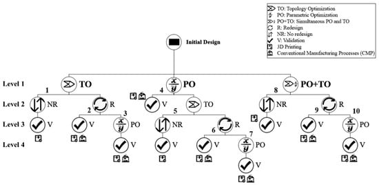 In addition, the authors clustered the design processes to those that can lead to designs that either can be mainly produced by AM (3D printing) or both by AM and CMP. An illustration of this categorization is depicted in Figure 3. Each of these processes consists of a maximum of four optimization levels. Furthermore, the main processes were classified, based on their first optimization level, in three main design workflows; TO, PO, and simultaneous PO and TO. The goal of these workflows was the mass reduction of the structures with respect to their yield strength. The first level optimization can be followed either by a no redesign/redesign or TO procedure at the second level and possibly, with a new PO round at third and fourth level for a further mass reduction.