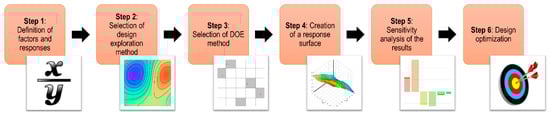 For the scope of this research, both the CAD, the Finite Element Analysis (FEA), as well as the topology and parametric optimizations, were conducted in ANSYS software. Concerning the TO, the LSM was used in ANSYS Mechanical. Furthermore, the PO was implemented in ANSYS DesignXplorer and was divided into six steps: Step 1. Definition of factors and responses, Step 2. Selection of design exploration method, Step 3. Selection of DOE method, Step 4. Creation of a response surface, Step 5. Sensitivity analysis of the results, and Step 6. Design optimization. The implemented process is depicted in Figure 4.