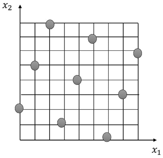 There are many different methods of DOE that have been developed to fit response surfaces. Some of the most known DOE methods are the Full factorial, the Fractional factorial, the Box-Behnken, the Plackett-Burman, the Latin Hypercube Sampling (LHS), the Central composite, and the Taguchi designs [18]. The selected DOE method in this paper is the LHS. The LHS is a statistical method that is used to generate random samples based on the given factors [26]. This method was preferred due to its data accuracy, efficiency, and flexibility in the presence of a large number of parameters [26]. As was presented by McKay, Beckman [27], at the LHS, the sample values are placed in a square grid, also known under the name Latin square. Unlike random sampling, the researcher using LHS needs to decide on the number and the placement of the sample points inside the square. If an experimental design consists of p design points and k number of factors (random variables), its sampling space is a p × k matrix. Each column of this matrix represents a variable, and each row a sample. An example of an LHS with two factors, nine design points, and nine levels in each factor is depicted in Figure 6. One challenge of the LHS is to place the chosen design points evenly within the design space in order to cover as much space as possible.