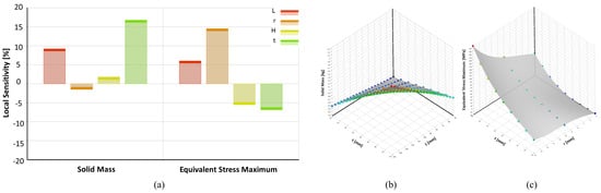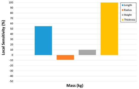 In the fifth step, the designer can conduct a sensitivity analysis of the results. A sensitivity analysis is the calculation of the objective function uncertainties in possible factors fluctuations. This analysis can be used as a diagnostic tool by the designer and can help him/her to identify and screen the most crucial parameters among them. These parameters, in their turn, can be used as a new focus in the PO of the structure [29]. An example of a sensitivity analysis diagram is shown in Figure 7. This diagram presents the norm of the partial derivatives of the chosen objective, in this case, the mass, with respect to the selected variables, herein: Length, radius, height, and thickness.