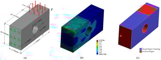 (a) The original design of the Hollow Plate, as well as the finite element model, (b) the Finite Element Analysis (FEA) of the Hollow Plate (σmax = 33.2 MPa), and (c) the design space for the Topology Optimization (TO).