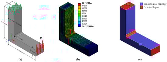 (a) The initial design of the L-Bracket, as well as the finite element model, (b) the FEA of the L-Bracket (σmax = 19.7 MPa), and (c) the design space for the TO.