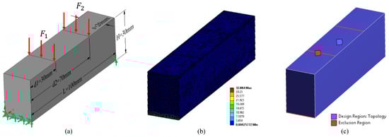 (a) The initial design of the Messerschmitt–Bölkow–Blohm Beam (MBB-Beam), as well as the finite element model, (b) the FEA of the MBB-Beam (σmax = 32.9 MPa), and (c) the design space for the TO.