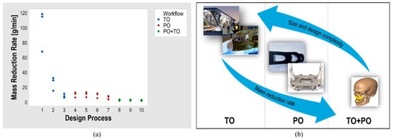 (a) The mass reduction in TO, PO, and PO + TO workflows, and (b) an illustration of the mass reduction in the three workflows vs. the size and design complexity, as well as typical examples in each workflow.