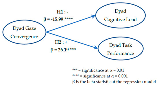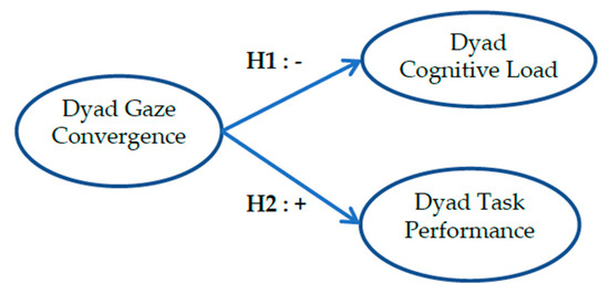 User cognition has been frequently investigated in the IS field and has been referred to as what occupies individual’s mind and that s/he is aware of or not while using a system [26,27]. Cognitive load has been a prominent construct of cognition studied in the HCI and IS disciplines, considered an indicator of efficient use of a system [28,29]. System user cognitive load has been referred to as the extent to which mental resources are employed by users to encode, activate, store, and manipulate data or information as they use a system [29,30]. The present study adopts this conceptual definition in the context of user dyads collaborating simultaneously on a shared system interface. Cognitive load at dyad level results not only from each individual mind alone but also from interactions between team members, that is, it also happens socially [31]. Users process information not only from the system interface but also the other dyad member. In the context of multiple users, some level of individual effort is needed in order to reach common objectives. Moreover, individual efforts have to be coordinated and aligned to ease collective task achievement [32]. Yet, the effort required for coordination could conceivably be eased when the dyad members share mental models [33] of the system interface they use together. A user’s mental model within any time range may develop from how and where he or she looks at the system interface. Thus, mental model is a mechanism through which the user generates descriptions of system purpose and visual form. This permits comprehension of system functions and observed system states, and prediction of future system states [33]. Consequently, when dyad members working together in real-time on a shared visual interface do not look at the same regions in the shared interface, they may not share the same mental model at specific moments, consequently requiring more cognitive resources to communicate and coordinate actions. Thus, we could hypothesize that the more users look at the same regions on the visual interface the less cognitive resources they will need to collaborate. Moreover, two collaborating users looking at the same locations are likely to perform better, as they would be able to better coordinate their interaction. Past research suggests that looking at the same visual objects in a system interface reduces miscoordination incidents, hence improving dyad coordination (e.g., Thepsoonthorn et al. [16]; Zhu et al. [34]). Yet, coordinated efforts facilitate the achievement of collective task, increasing team performance [32,35,36]. Hence, we make the following hypotheses (H).