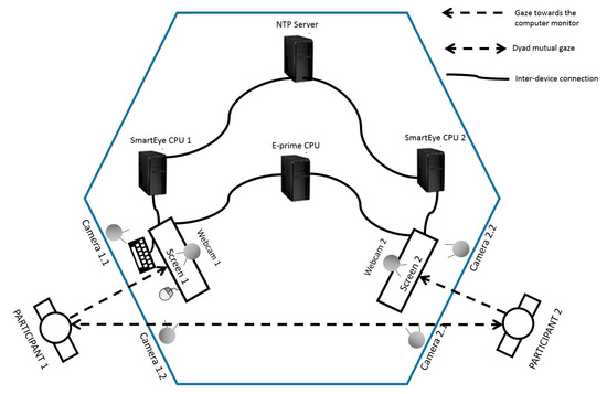 We used SmartEye Pro (SmartEye, Gothenburg, Sweden) eye-tracking system, which enables a non-invasive temporally synchronous collection of gaze and pupil data of multiple participants. This system employs two cameras per participant for large field of view and permits measurement of a head orientation and gaze direction in 3D, including the ability to discriminate between gaze directed at the interface or at the other user in the dyad. SmartEye Pro also permits measurement of pupil diameter in real-time during the task, and it provides a great gaze accuracy (around 0.5 degrees [42] for a 30 cm eye distance—a 1 degree gaze accuracy is considered high in the eye-tracking literature [25,43,44,45]). It was configured with a sampling rate of 60 Hz. To synchronize computer clocks at all times during the studies, we configured a Network Time Protocol (NTP) Server. NTP protocol is designed to synchronize several computers’ clocks across variable-delay networks, with an accuracy below one millisecond between network devices [7].