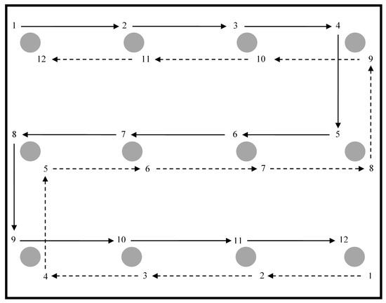 Experimental stimulus: circle movement sequences. The bold frame represents computer screen. The gray circles represent the twelve possible positions of either blue or red circle. Solid arrows represent blue circle’s movement sequence. Dotted arrows represent red circle’s movement sequence. Each ordered number sequence (from 1 to 12) depicts the direction of blue circle’s course and the red circle’s course, respectively.