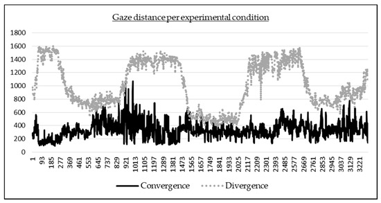Average gaze distances within dyads in each experimental condition. The sinusoidal trend in the Divergence condition is consistent with the fact that the blue and the red circles alternatively moved closer to or farther from each other overtime.