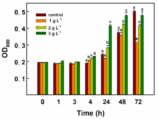 Chlorella sorokiniana growth determined by optical density (OD800) estimation in control cells and after different bicarbonate addition NaHCO3 1 g L−1, 2 g L−1, and 3 g L−1. Error bars represent SD (n = 3). The values with the same letter were not significantly different (p ≤ 0.001, ANOVA, Tukey’s multiple comparison).