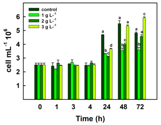 Cellular density (cells mL−1) in Chlorella sorokiniana control and bicarbonate enriched cultures (NaHCO3 1 g L−1, 2 g L−1, and 3 g L−1). Error bars represent SD (n = 3). The values with the same letter were not significantly different (p ≤ 0.001, ANOVA, Tukey’s multiple comparison).