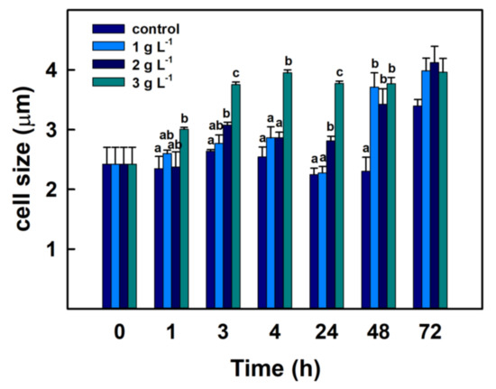 In terms of the number of cells (Figure 2), no significant differences emerged in the first 4 h. After 24 h, the control showed the highest number of cells with a strong difference with other treatments, among which NaHCO3 3 g L−1 displayed higher values. After 48 h, the control was still characterized by the highest number of cells, but NaHCO3 3 g L−1 showed a net increase with a value similar to that of the control. Treatments 1 and 2 g L−1 presented a lower number of cells, with 1 g L−1 being the lowest. At the end of the experiment, the treatment with the highest number of cells was 3 g L−1 that exceeded the control. As regards 1 g L−1 and 2 g L−1, both displayed the same pattern observed at 48 h, with 2 g L−1 characterized by a higher number of cells. The difference in the average cells’ size is shown in Figure 3. Already after 1 h from NaHCO3 addition, the size of cells supplemented with 3 g L−1 appeared larger (3.0 ± 0.03 µm) with respect to control (2.4 ± 0.3 µm) and to the other conditions. Until 24 h, the cells added with NaHCO3 3 g L−1 showed a larger diameter than the cells of the other conditions. From 48 to 72 h, the cells of the other two experimental conditions (NaHCO3 1 and 2 g L−1) also increased their diameter compared to the control (Figure 3). In Table S1, the data concerning the variations of growth rate and doubling time in the control cells and in the experimental cultures are shown.