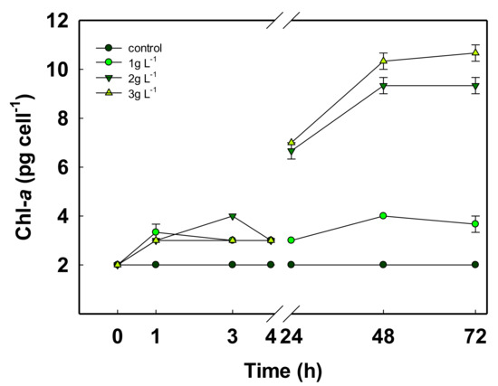 The chlorophyll a (Chl-a) content per cell was determined during 72 h of the experiment in each treatment (Figure 4). While the control did not show any increase in Chl-a for the overall duration of the experiment, the amount of Chl-a in other treatments increased up to 50%–65% after 1 h later from the NaHCO3 administration, remaining high until 4 h. After 24 h, the Chl-a content was different among the treatments. NaHCO3 2 g L−1 and NaHCO3 3 g L−1 showed the highest values of Chl-a, almost two times more than NaHCO3 1 g L−1. At 72 h, in the culture enriched with NaHCO3 3 g L−1, Chl-a content reached 10.7 ± 0.3 pg cell−1, followed by NaHCO3 2 g L−1 (9.3 ± 0.3 pg cell−1), and 1g L−1 (3.7 ± 0.3 pg cell−1). The Phaeo/Chl-a ratio (Table 1), calculated as a proxy of active chlorophyll [51,52], remained constant (~1) in the control treatment for the entire duration of the experiment (72 h). In bicarbonate treatments, the ratio Phaeo/Chl-a slightly increased after 3 h, then values tended to decrease, showing a weak difference between the control and NaHCO3 (2 and 3 g L−1) supplemented after 72 h. Further details on the effect of bicarbonate addition on the concentration of other photosynthetic pigments have been reported in the Supplementary Materials (Table S2) as pigment:Chl-a ratios. Although additional analyses are required, these preliminary data seem to suggest that the lutein:Chl-a ratio slightly increased in bicarbonate treated cells, particularly those supplemented with 3 g L−1. A typical chromatogram of photosynthetic pigments extracted in Chlorella sorokiniana cells is shown in the Supplemental Material (Figure S1).